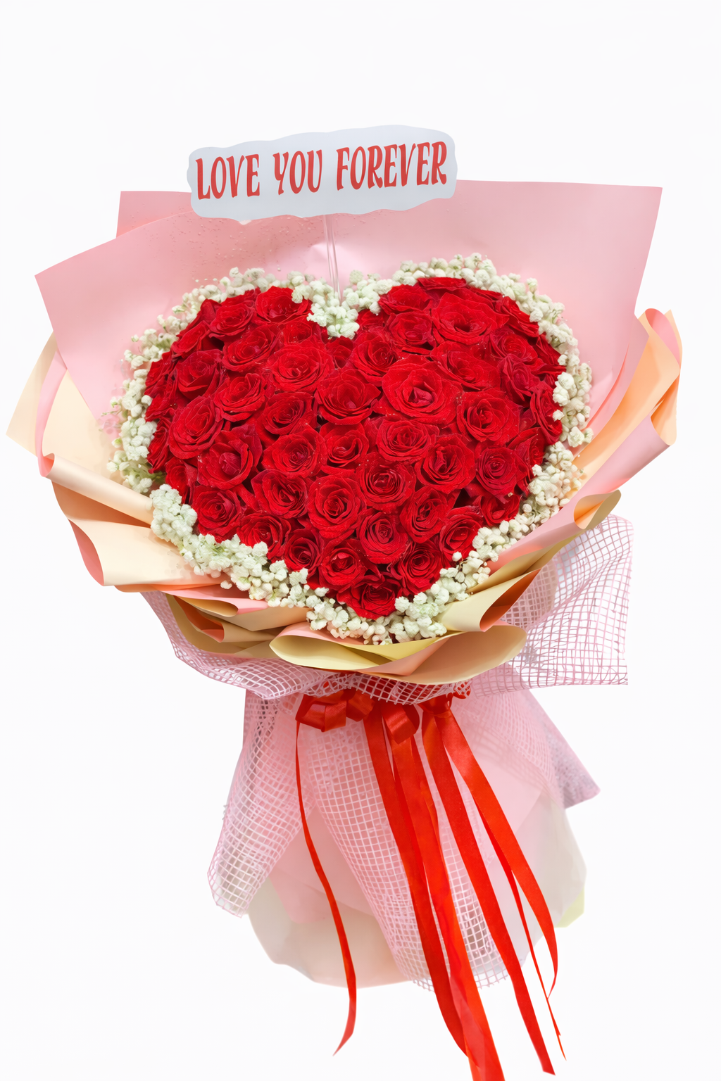 Say I love you forever with our Love You Forever Heart Red Roses Bouquet, a romantic heart-shaped arrangement made with premium fresh red roses and finished with delicate baby’s breath, elegant wrapping, and a decorative “Love You Forever” sign.